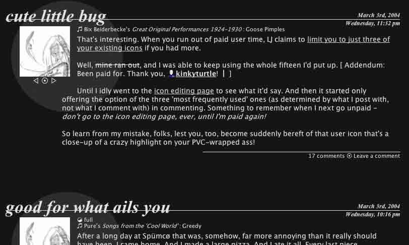 Also, I came up with a throwaway feature - I can flick a switch, and people who go to my main journal page will see no entry content, just titles, if they're not logged in to LJ. There're ways around it, of course, and I'm not interested in actually having it set that way - it's just a 'hey! I bet I could do this!" kind of feature.]