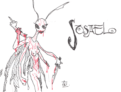 Yes, that's her own severed forearm giving you the finger... I'm becoming a teenage girl again, I get to draw cutter characters. But since I'm a well-practiced cartoonist, I don't stop there! I caricature it three times over, and make it my own! (It also helps that the roleplay world Sosael lives in is one in which death is very not-permanant.)