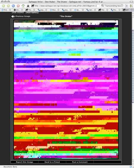 I don't even think about trying to alter them to make Epilogue's editors happy. When they're done, they're done, and I'm not going to tweak them, unless it's for, like, money - the only other web gallery that's ever given me a single bit of hassle is Yerf, when my 'minimal vixen' abstract piece caused whining in the forums, and the semi-official declaration of the "No Pure Abstraction" rule (which I really wish they'd add to the rules).